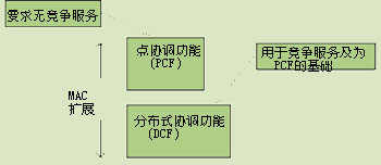 基本服务群(BSS)是无线局域网的基本单元,它的功能包括分布式协调功能(DCF)和点协调功能(PCF)。协调功能是决定在BSS内工作的一个站,通过WM何时允许发送和可能接收协议单元的逻辑功能。DCF是802.11MAC协议的基本媒体访问方法,作用于基本服务群和基本网络结构中,可在所有站实现,它支持竞争型异步业务。而PCF可支持无竞争型时限业务及无竞争型异步业务。其基本结构如上图所示。
